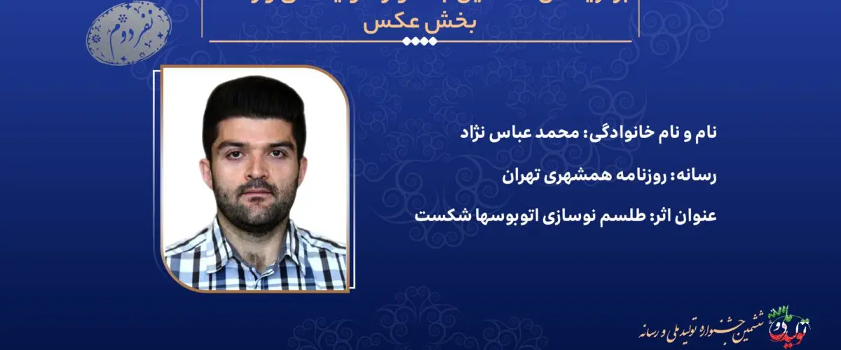 «محمد عباسنژاد» از «روزنامه همشهری تهران»Agradدسامبر 7, 2024نفر دوم/ «محمد عباسنژاد» از «روزنامه همشهری تهران» برای اثری با عنوان «طلسم نوسازی اتوبوسها ... ادامه مطلب