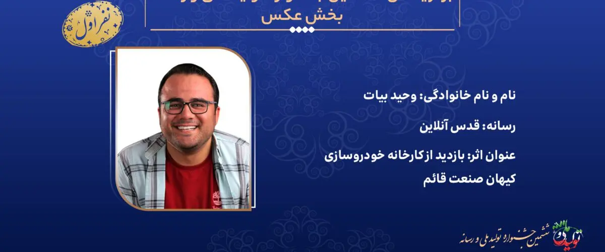 «وحید بیات» از «قدس آنلاین»Agradدسامبر 7, 2024نفر اول/ «وحید بیات» از «قدس آنلاین» برای اثری با عنوان «بازدید از کارخانه خودروسازی ... ادامه مطلب
